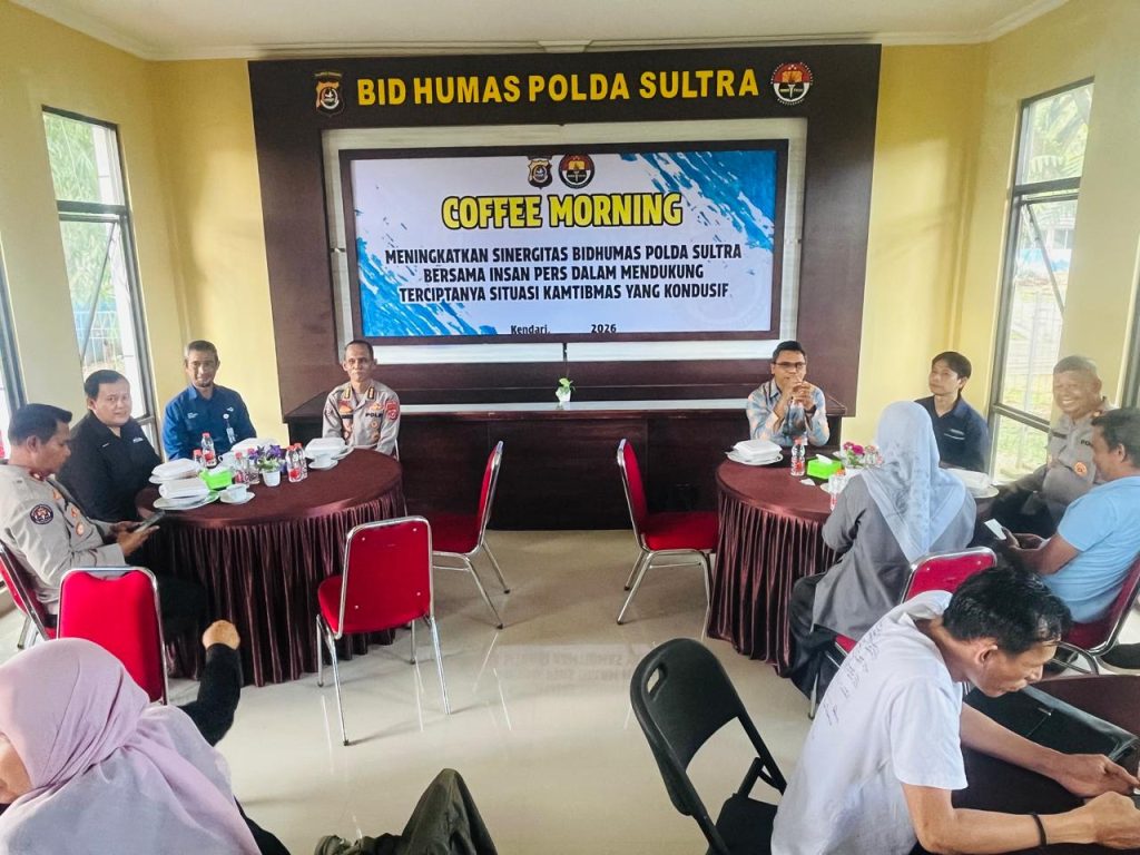 HaluOleoNews.ID, KENDARI – Kepolisian Daerah (Polda) Sulawesi Tenggara (Sultra) melalui Bidang Humas menggelar kegiatan Coffee Morning bersama insan pers sebagai upaya memperkuat sinergitas dalam mendukung terciptanya situasi keamanan dan ketertiban masyarakat (kamtibmas) yang kondusif.