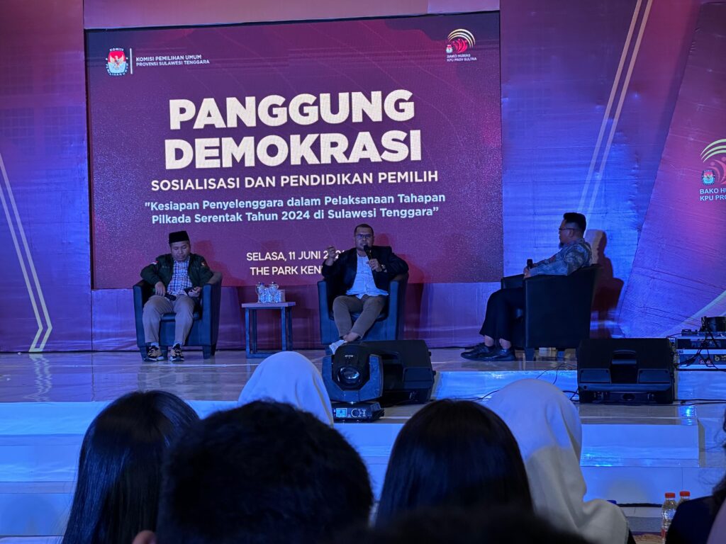 Koordinator Divisi (Kordiv) Parmas dan SDM KPU Sultra, Amiruddin bersama Komisioner Bawaslu Bahari menjadi pemateri dikesempatan baik ini. Amiruddinmengungkapkan, Panggung Demokrasi bertujuan untuk mengajak masyarakat mendiskusikan praktek demokrasi di Pilkada ini seperti apa.