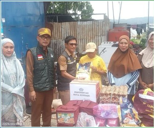 Sebagai bentuk respons cepat pemerintah daerah, Dinas Sosial Kota Kendari kemudian menyalurkan bantuan logistik permakanan kepada tiga keluarga terdampak pada Senin (9/3/2026).