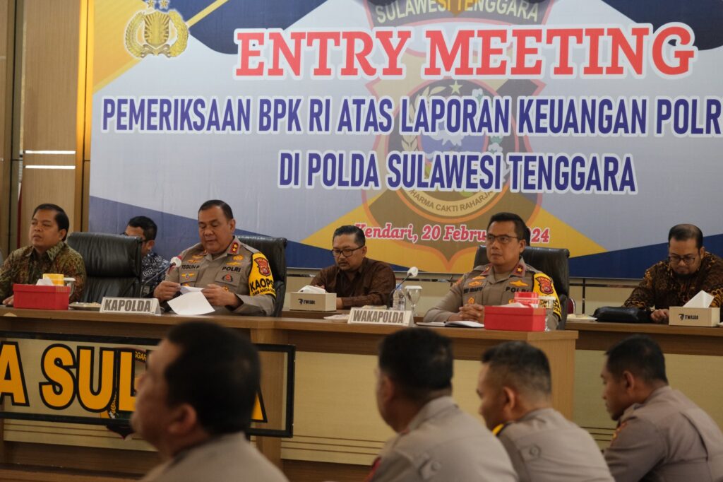 HaluoleoNews.ID, KENDARI- Entry Meeting, pemeriksaan BPK RI atas laporan keuangan Polda Sultra tahun anggaran 2023. Kegiatan tersebut dibuka langsung oleh Kapolda Sultra Irjen Pol. Drs. Teguh Pristiwanto, bertempat di Aula Dachara, pada Selasa 20 Februari 2024