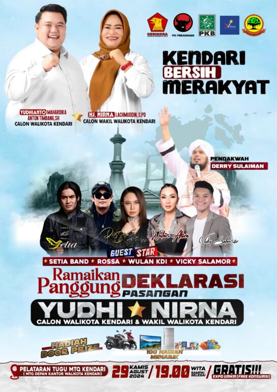HaluoleoNews.ID, KENDARI- Hari ini, Kamis (29/8/2024) Deklarasi pasangan Calon Wali Kota Kendari dan Wakil Wali Kota Kendari, Yudhianto Mahardika dan Nirna Lachmuddin siap menjadi ajang pesta rakyat yang meriah. Dengan mengusung tema “Bersih dan Merakyat” acara yang akan digelar di Pelataran Tugu MTQ Kendari.
