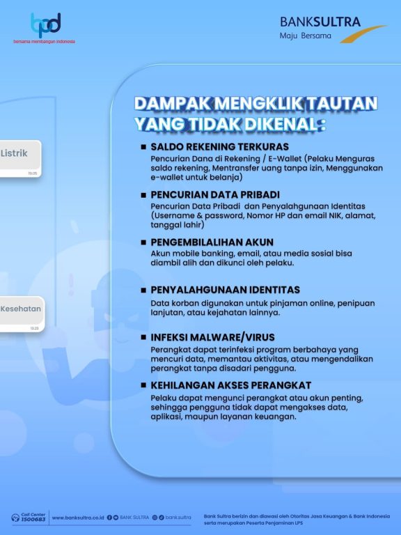 Berdasarkan himbauan keamanan Bank Sultra, tindakan mengklik tautan sembarangan dapat berakibat fatal, antara lain: