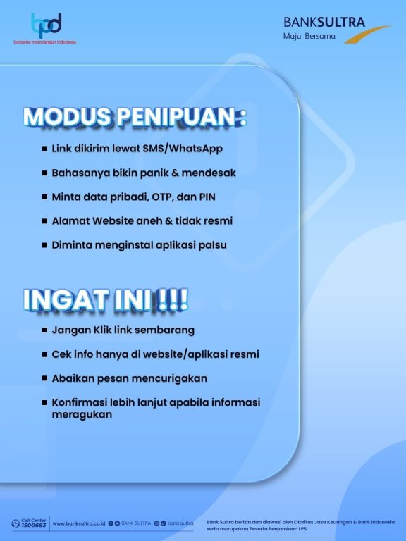 Menanggapi hal ini, Direktur Utama Bank Sultra, Andri Permana Diputra Abubakar, memberikan pernyataan tegas demi keamanan seluruh nasabah. “Keamanan dana dan data nasabah adalah prioritas utama Bank Sultra. Kami menegaskan bahwa Bank Sultra tidak pernah meminta data rahasia seperti PIN, Password, Kode OTP, atau meminta nasabah mengunduh aplikasi di luar Play Store/App Store resmi melalui pesan pribadi,” ungkapnya.