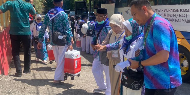 HaluoleoNews.ID, MAKASSAR- Gelombang pertama jemaah calon haji Kota Kendari tahun 2023 yang tergabung dalam kelompok terbang (kloter) 24 dan 25 Ujung Pandang (UPG) tiba di Asrama Haji Sudiang Makassar dengan selamat, Rabu (7/6/2023).