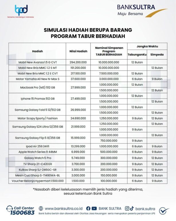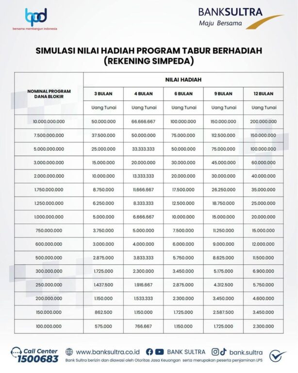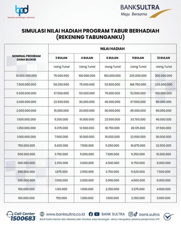 “TABUR BERHADIAH adalah program pemberian free gift dan direct gift (tanpa proses undian) kepada nasabah yang melakukan penyetoran dana fresh ke rekening Tabungan Bank Sultra dan bersedia diblokir dalam jangka waktu tertentu dengan nilai sesuai ketentuan berlaku,” ujarnya kepada media ini, Kamis (15/8/2024).