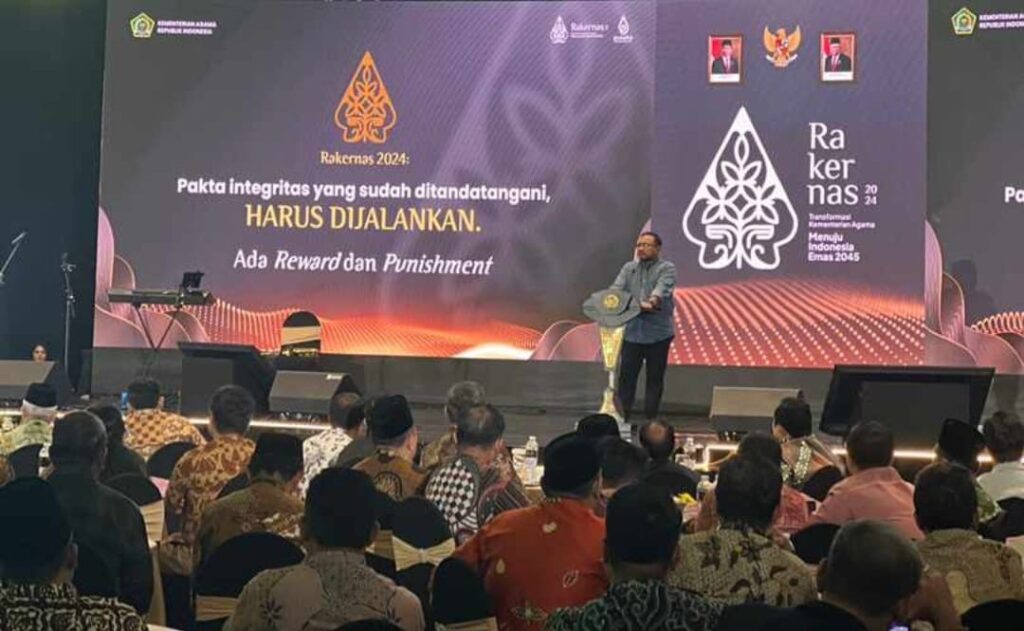 HaluoleoNews.ID, SEMARANG- Menteri Agama Yaqut Cholil Qoumas meminta seluruh pimpinan satuan kerja Kementerian Agama (Kemenag) menandatangani Pakta Integritas. Hal ini menjadi momen puncak pelaksanaan Rapat Kerja Nasional (Rakernas) Kemenag 2024.