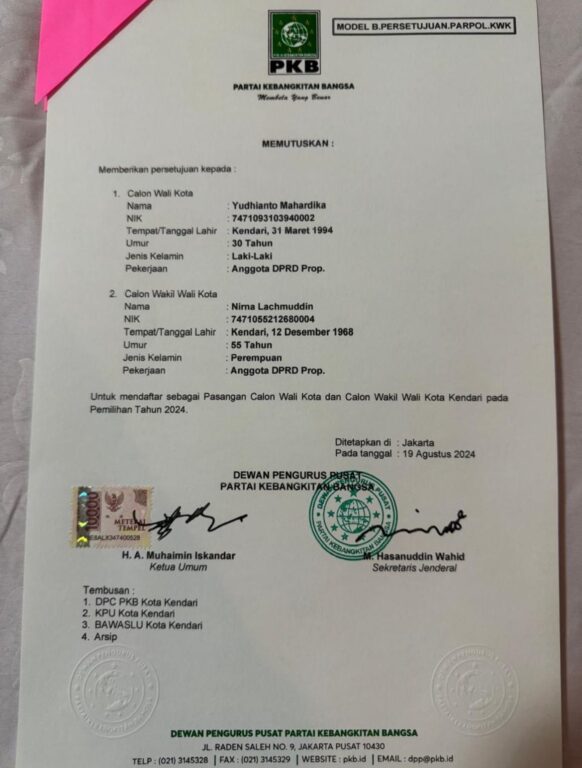 HaluoleoNews.ID, KENDARI – Partai Kebangkitan Bangsa (PKB) resmi mendukung pasangan calon (Paslon) Wali Kota dan Wakil Wali Kota Kendari, Yudhianto Mahardika Anton Timbang-Hj.Nirna Lachmuddin untuk bertarung di Pemilihan Wali Kota (Pilwali) Kota Kendari 27 November 2024.
