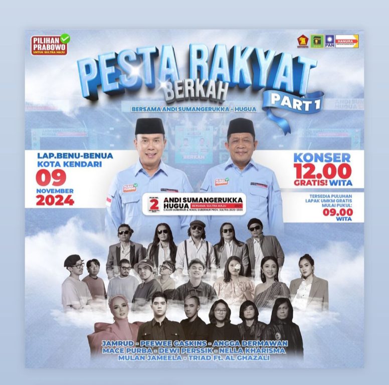 HaluoleoNews.ID, KENDARI- Calon Gubernur (Cagub) Nomor Urut 2, Andi Sumangerukka (ASR)- Hugua menghadirkan berbagai artis Ibu Kota dalam rangka Pesta Rakyat Berkah Part I. Adalah, Triad Ft. Al Ghazali, Mulan Jameela, Nella Kharisma, Dewi Persik, Mace Purba.