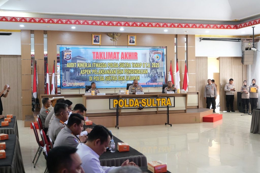 HaluOleoNews.ID, KENDARI — Polda Sulawesi Tenggara (Sultra) melaksanakan _Taklimat Akhir Audit Kinerja_ Itwasda Polda Sultra Aspek Pelaksanaan dan Pengendalian Tahap II Tahun Anggaran 2025 pada Senin, 8 Desember 2025, mulai pukul 10.00 Wita hingga selesai. Kegiatan tersebut berlangsung di Aula Dhacara Polda Sultra dan menjadi bagian penting dari rangkaian agenda pengawasan internal di lingkungan kepolisian daerah.