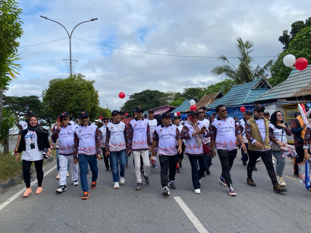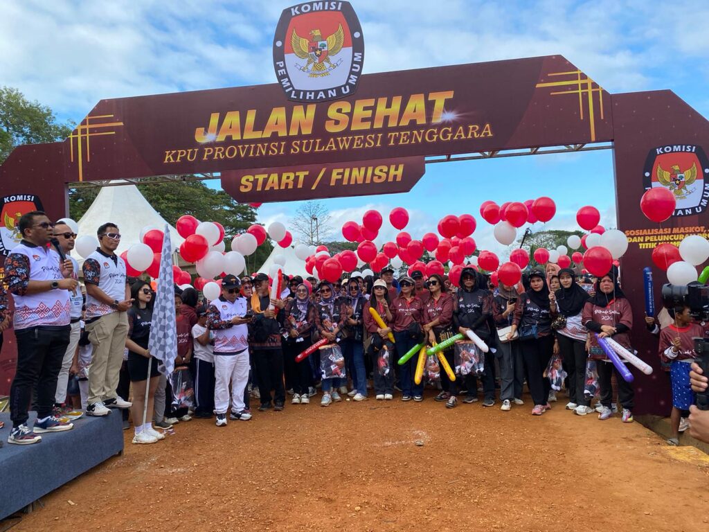 Kali ini lewat Jalan Sehat, KPU menyosialisasikan, maskot, jingle dan Peluncuran Program Titik Kumpul Pilkada di Lapangan Benubenua, Kecamatan Kendari Barat, Minggu (28/7/2024).