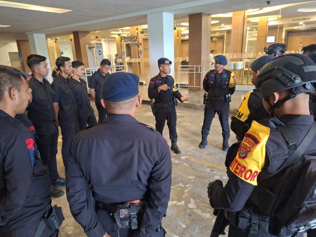 HaluoleoNews.ID, KENDARI- Detasemen Gegana Brimob Polda Sulawesi Tenggara (Sultra) melaksanakan sterilisasi di ruang pleno rekapitulasi suara Pemilihan Gubernur dan Wakil Gubernur Sultra yang bertempat di Hotel Claro Kendari. Langkah ini dilakukan untuk memastikan lokasi aman dari segala potensi ancaman, baik yang bersifat fisik maupun nonfisik, pada 6 Desember 2024.